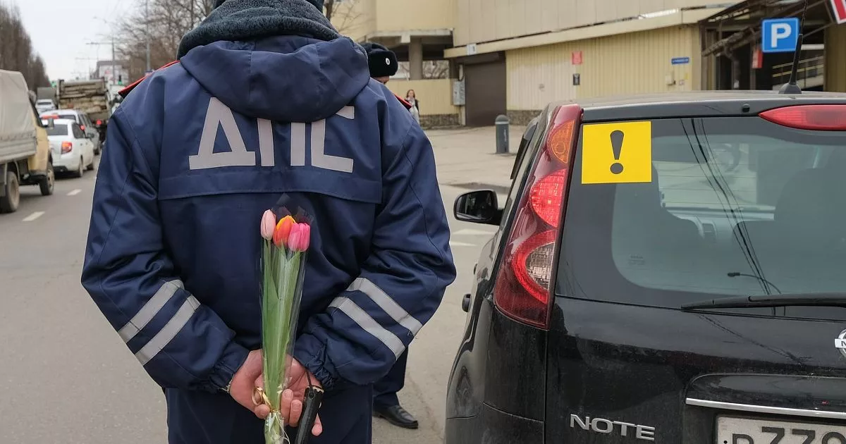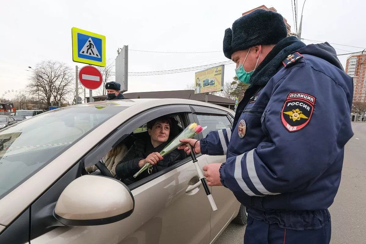 Сотрудники Госавтоинспекции останавливали женщин-водителей, но не из-за нарушений, а для того, чтобы поздравить их с наступающим праздником и вручить тюльпаны.