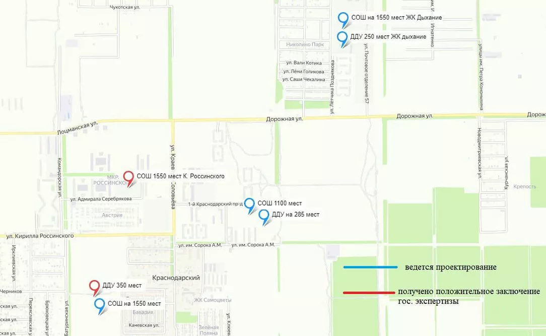 — В целом, в этом массиве жилой застройки, включающей микрорайон Россинского, поселок Краснодарский и строящийся ЖК «Дыхание», планируется семь социальных объектов — четыре школы и три детских сада. Строительство первой большой школы уже стартовало. В ближайшие несколько месяцев приступят к детскому саду на 350 мест. В течение