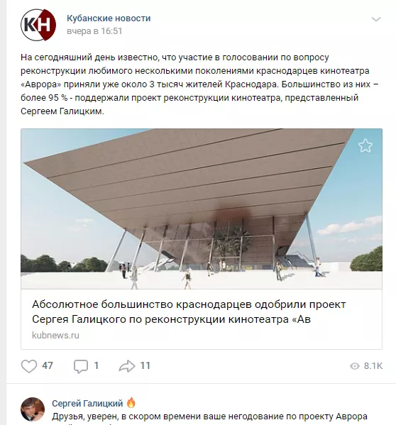 Новость о том, что в голосовании по реконструкции кинотеатра «Аврора» почти все краснодарцы поддерживают проект представленный Сергеем Галицким, вызвала большой резонанс. Она была опубликована во всех соцсетях и вызвала заметную реакцию. Вишенкой на торте стал комментарий в нашем аккаунте «ВКонтакте»от пользователя с ником Сергей Галицкий.
