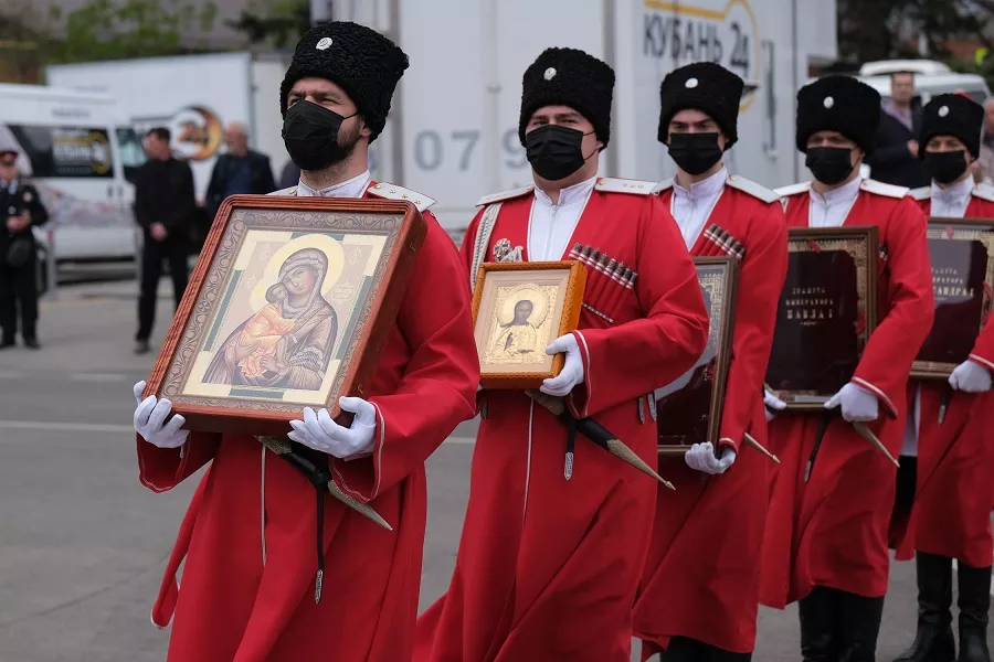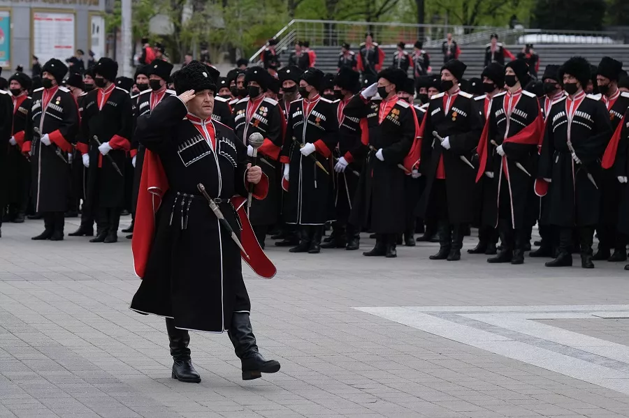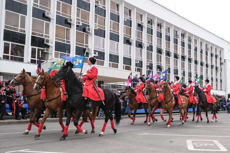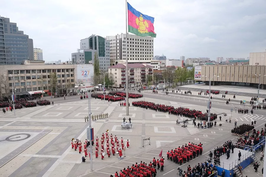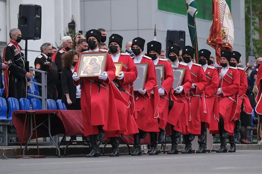 Почетный караул торжественно вынес регалии Кубанского казачьего войска на площадь. В том числе, это жалованная грамота императрицы Екатерины II, исторические знамена, а также иконы, подаренные казакам патриархами Всея Руси. После этого парадные расчеты прошли торжественным маршем по площади.