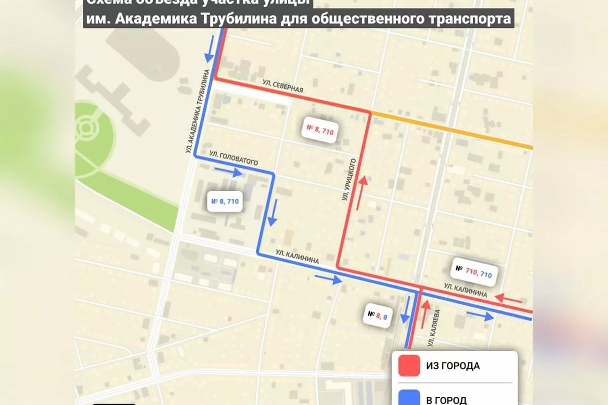 Автобусы № 8, 710 в направлении центральной части города пойдут по ул. им. Академика Трубилина, затем по улицам им. Головатого, 1-я Линия, им. Калинина и далее по маршрутам. В обратном направлении — по ул. им. Калинина, затем по улицам им. Урицкого, Северной, им. Академика Трубилина и далее по маршрутам.