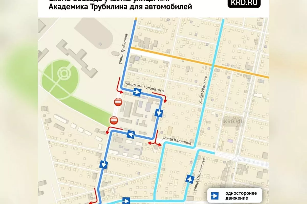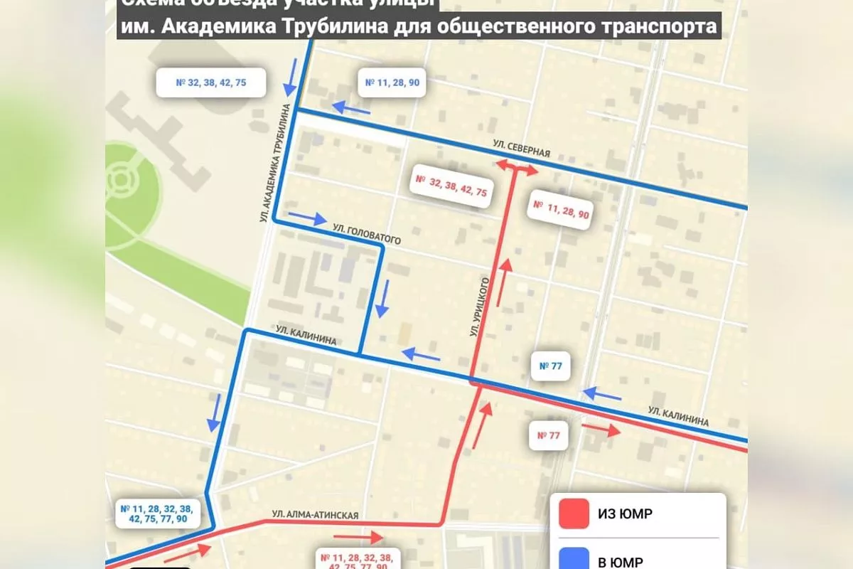 Таким образом, автобусы №№ 11, 28, 32, 38, 42, 75, 90, двигаясь в направлении ЮМР, пойдут по ул. им. Академика Трубилина, затем по улицам им. Володи Головатого, 1-я Линия, им. Калинина, им. Академика Трубилина, Алма-Атинской и далее по маршрутам. В обратном направлении — по ул. Алма-Атинской, затем по улицам им. Урицкого, Северной и далее по маршрутам.