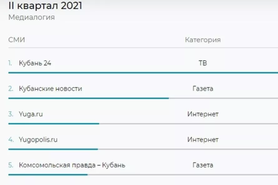 По итогам второго квартала 2021 года лидерами медиарейтинга стала телекомпания «Кубань 24». Второе место досталось газете «Кубанские новости», а на третьей строчке оказался сайт «Юга.ру».