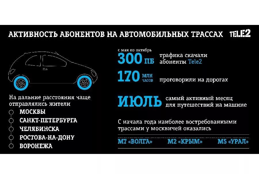 С мая по октябрь абоненты Tele2 скачали на трассах 277 петабайт интернет-трафика. Также за этот период путешественники проговорили 170 миллионов часов. Чаще всего на дальние расстояния на автомобиле отправлялись жители Москвы и Подмосковья, Санкт-Петербурга и Ленинградской области. Также активны были жители Челябинска, Ростова-на-Дону и Воронежа.