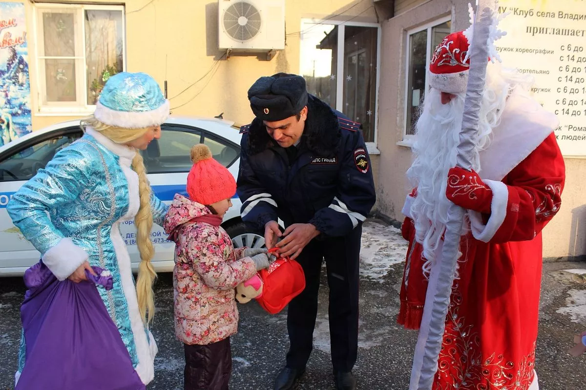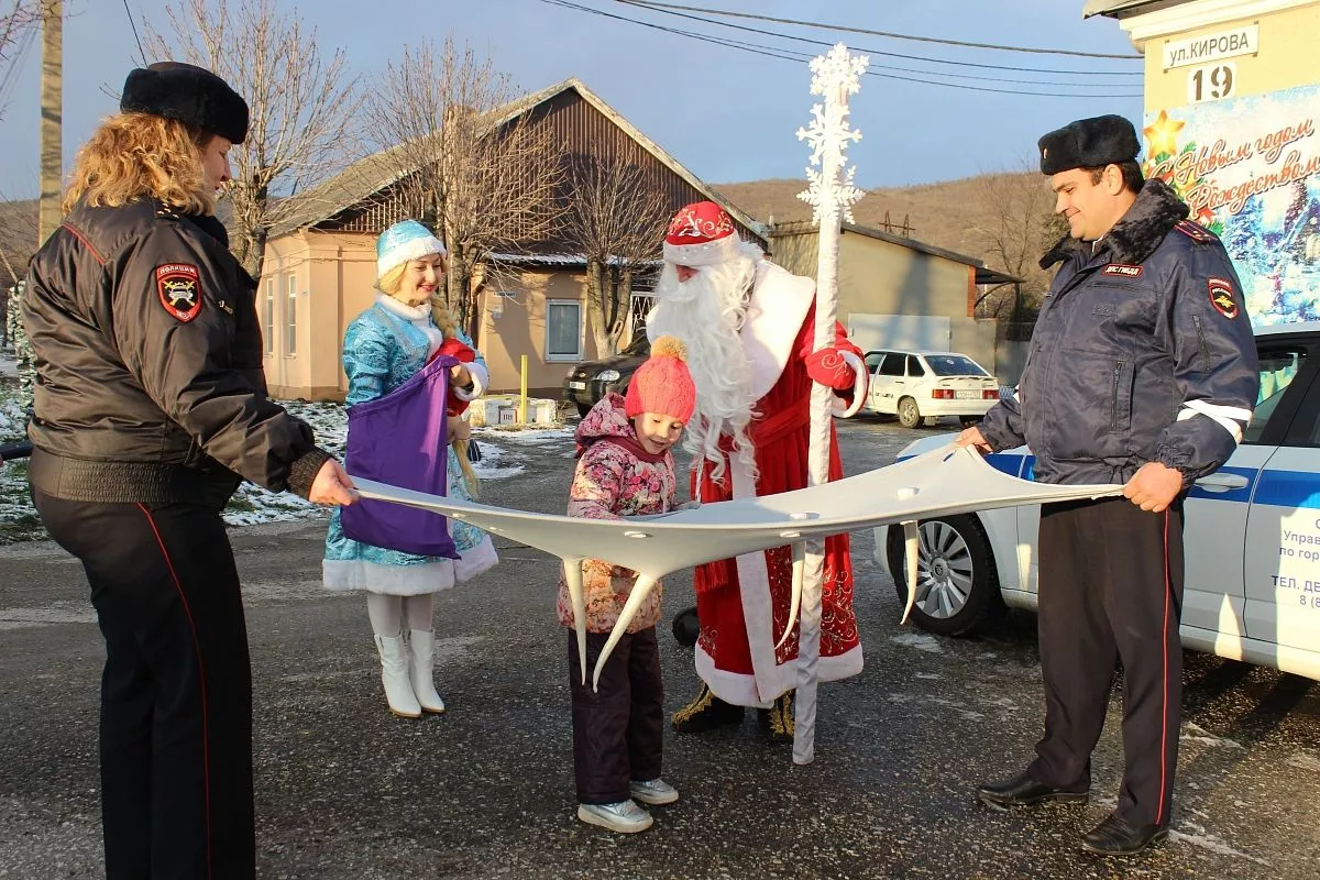 В Новороссийске Полицейский Дед Мороз поздравил с Новым годом спасенную им после ДТП девочку.