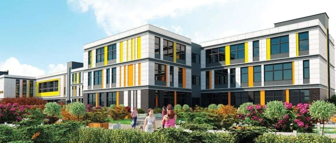 Школа на 1100 мест расположится на участке 2,5 га. По проекту, в трехэтажном здании площадью 23,7 тыс. кв. м разместят блоки начальной и средней школы. На первом этаже спроектирована столовая на 450 мест и буфет на 60 мест, на втором — большой и малый спортивный залы, тренажерный зал и два актовых зала — на 100 и 499 мест. В школе будет более 60 кабинетов для обучения профильным предметам, мастерские, библиотека с медиатекой, школьный музей. На прилегающей территории предусмотрены спортивные площадки с прорезиненным покрытием для волейбола, баскетбола, подвижных игр и мини-футбола. Срок сдачи объекта – октябрь 2023 года, ввод в эксплуатацию – до конца 2023 года.