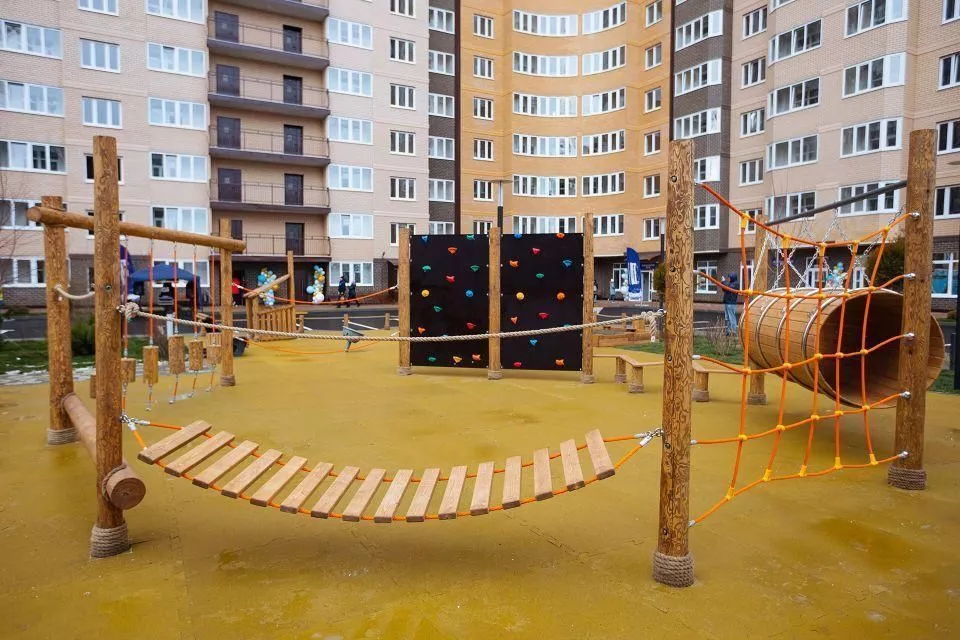 Вместе с домом сдали детскую площадку в стиле эко и аллею для прогулок.