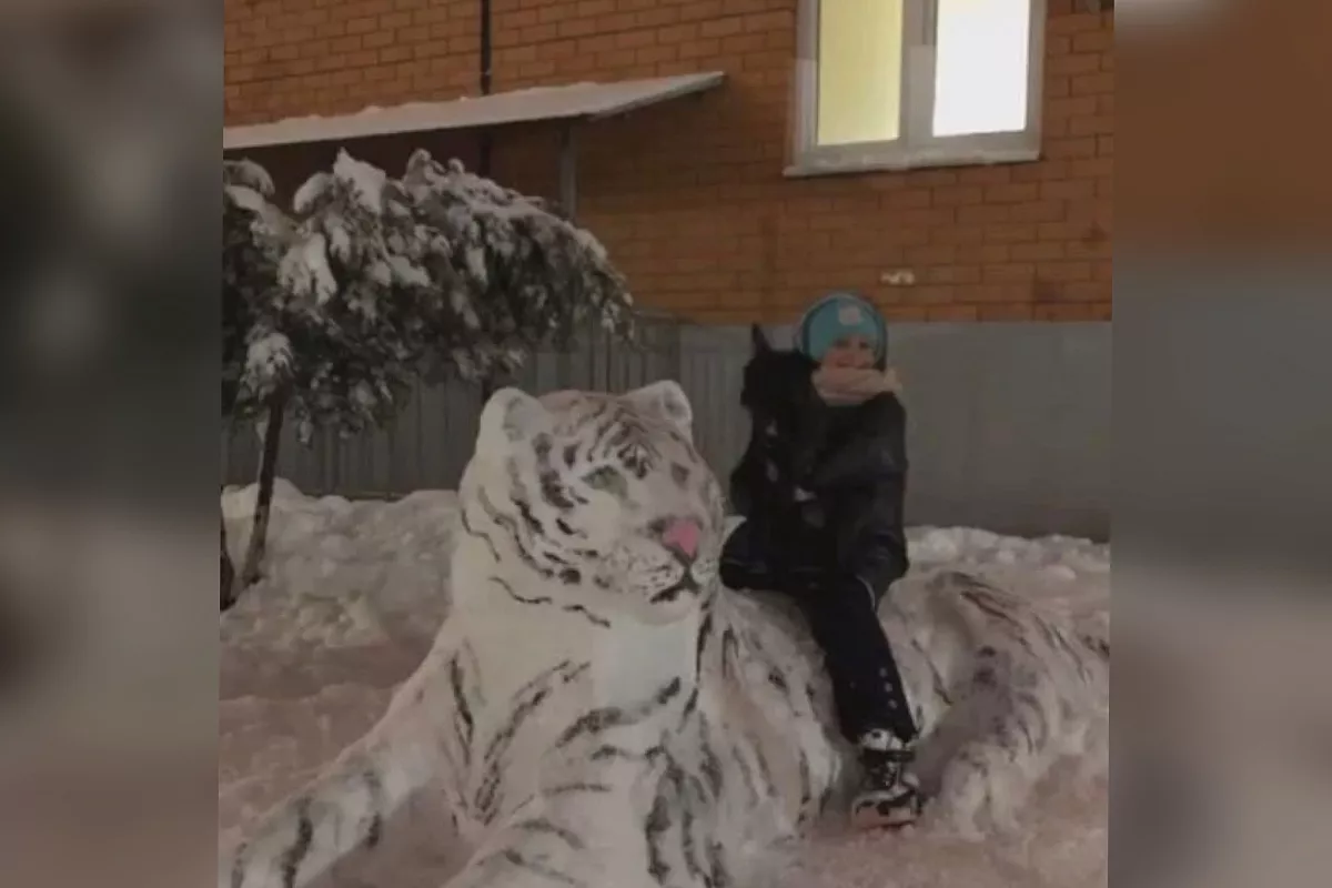 Однако это не единичный снежный шедевр. В соцсетях даже объявили «парад снеговиков» - конкурс на самую креативную скульптуру из снега. Например, юные жители Прикубанского округа Краснодара слепили огромного белого тигра и краской нарисовали ему черные полоски и розовый нос. На спине у лежащего тигра легко умещается один ребенок.