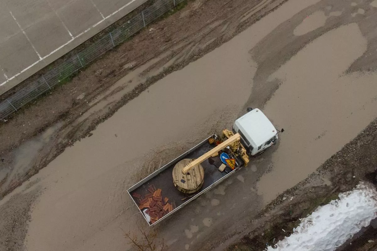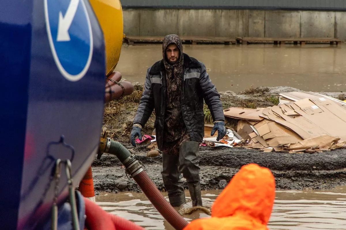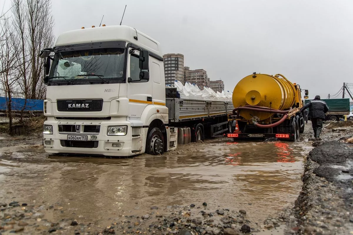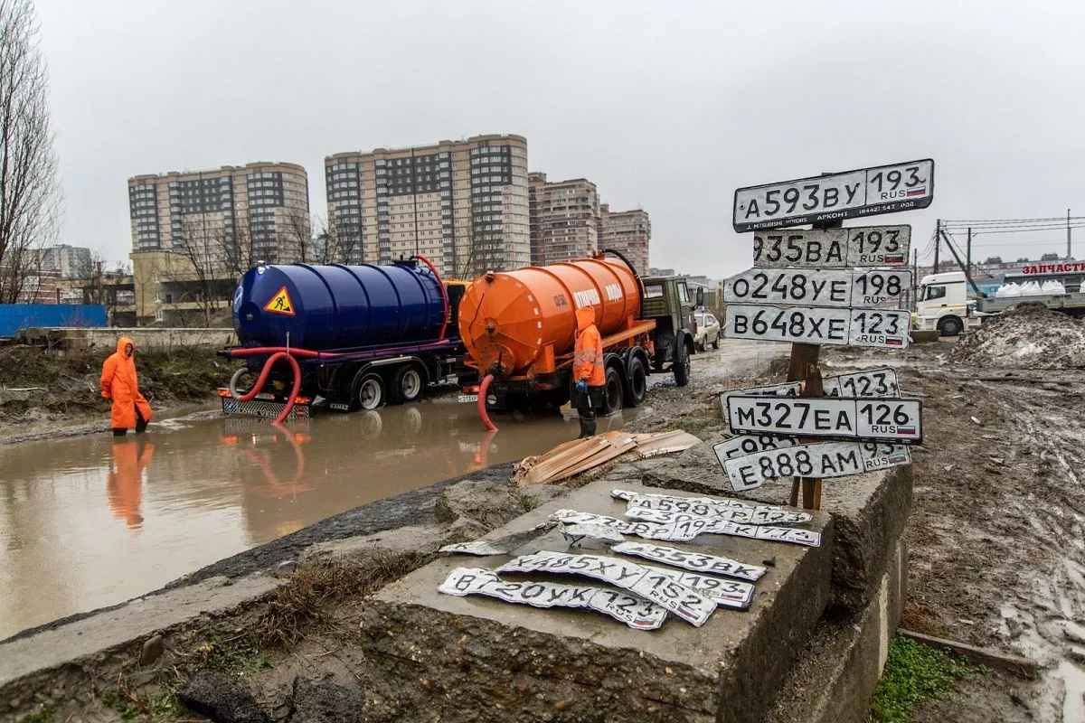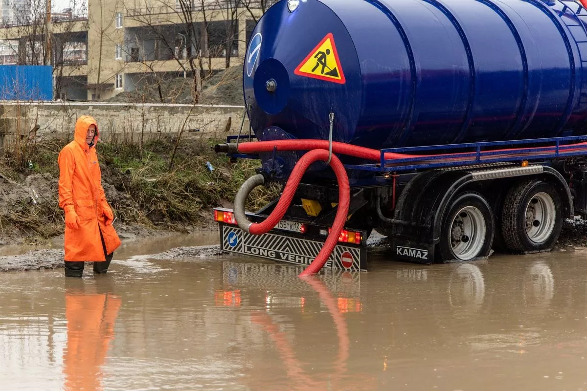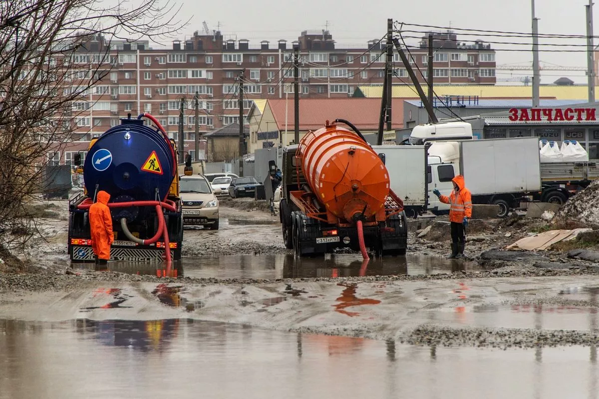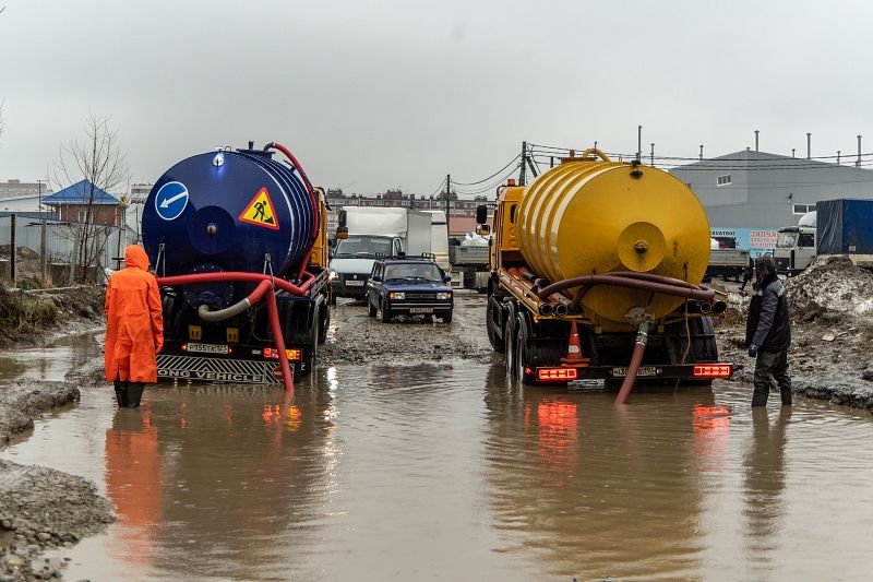 Как сообщили в пресс-службе администрации Краснодара, водооткачивающая техника работает на 11 улицах, в том числе Автомобильной. С огромной лужей пытаются справиться сразу две цистерны.
