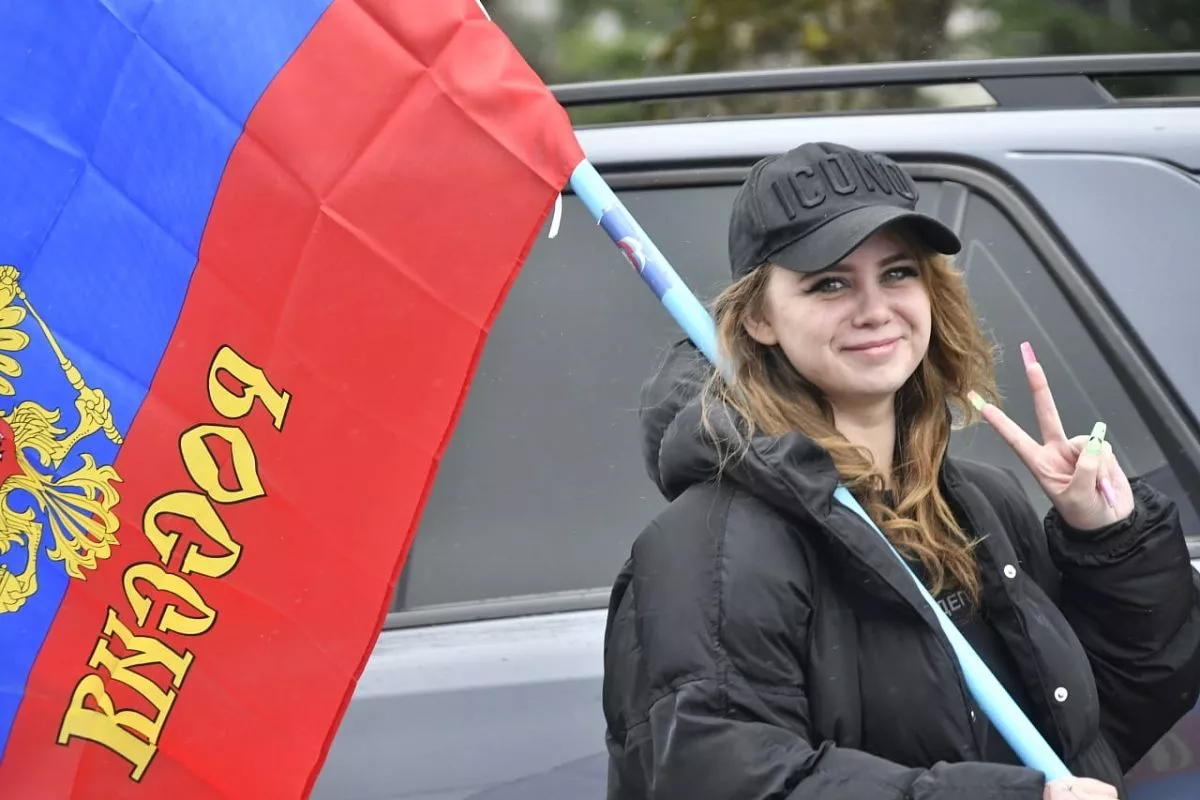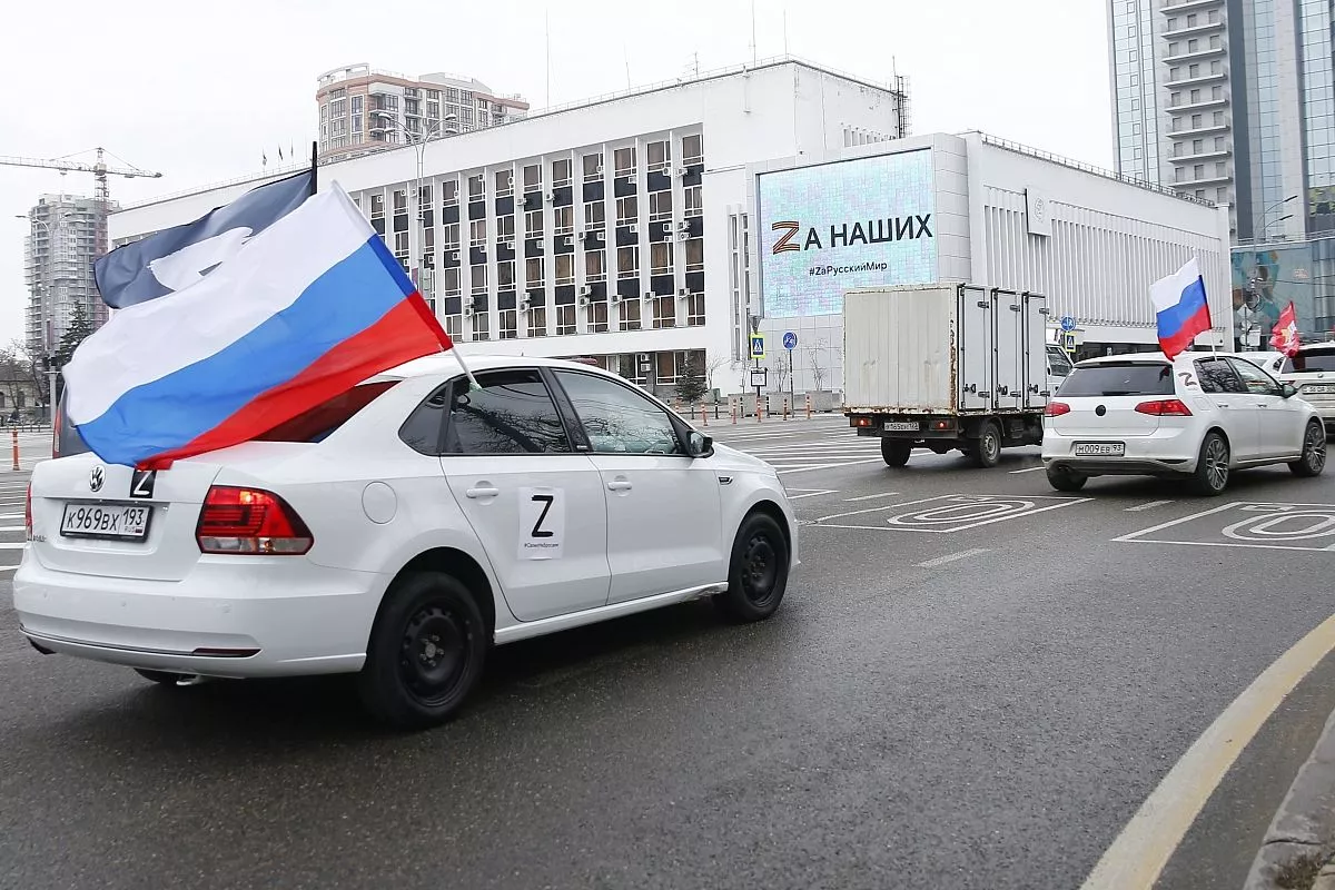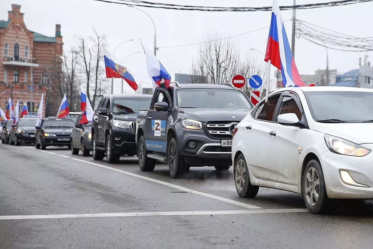 На машинах участников автопробега были наклеены стикеры с изображением символа «Z», из окон развевались флаги Российской Федерации и Георгиевские ленты.