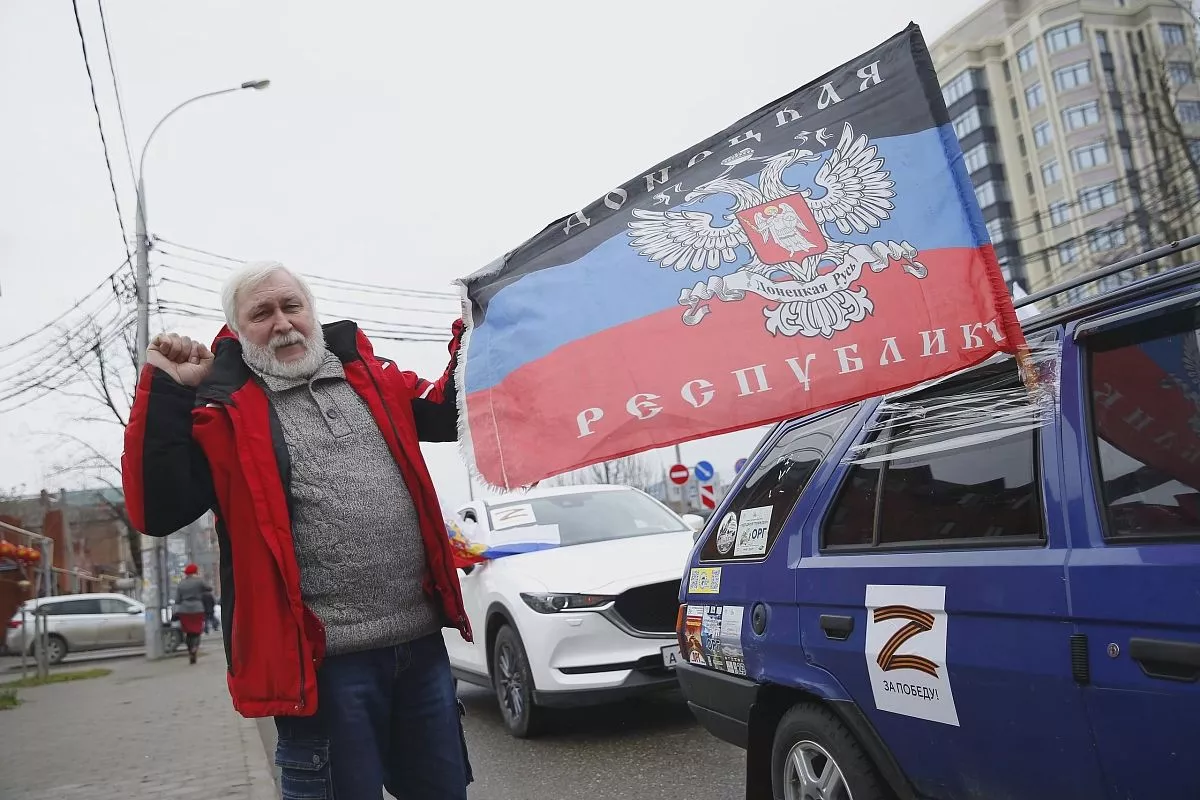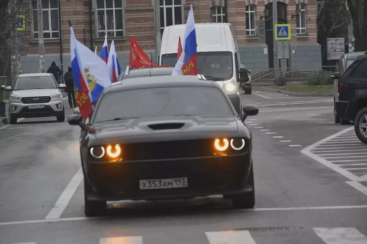 На машинах участников были наклеены стикеры с изображением символа Z, из окон развевались флаги Российской Федерации и Георгиевские ленты.