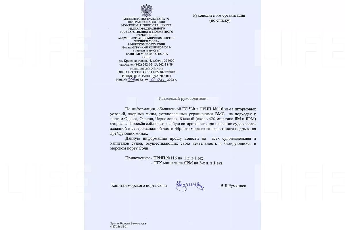 В предупреждении, подписанном капитаном морского порта Сочи Вячеславом Румянцевым, говорится, что «из-за штормовых условий, якорные мины, установленные украинскими ВМС на подходах к портам Одесса, Очаков, Черноморск, Южный (около 420 мин типа ЯМ и ЯРМ), оторваны».
