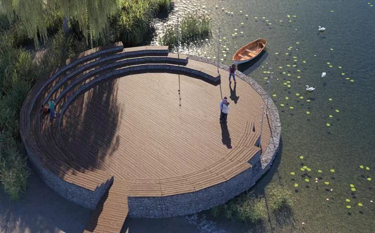 На территории создадут несколько тематических зон. Оборудуют спортивную, теннисную и воркаут площадку, две детские площадки с игровыми элементами. Появятся зона для пикников, беседки, фестивальная поляна, амфитеатр и кафе. Реконструируют лестницу и расширят смотровую площадку, организуют веломаршрут, прогулочную зону вдоль озера Копытце и пляж. Также на территории установят скамейки, декоративные элементы, оборудуют парковку. Необычные решения запланированы в озеленении парка: водные сады и плавающие острова.