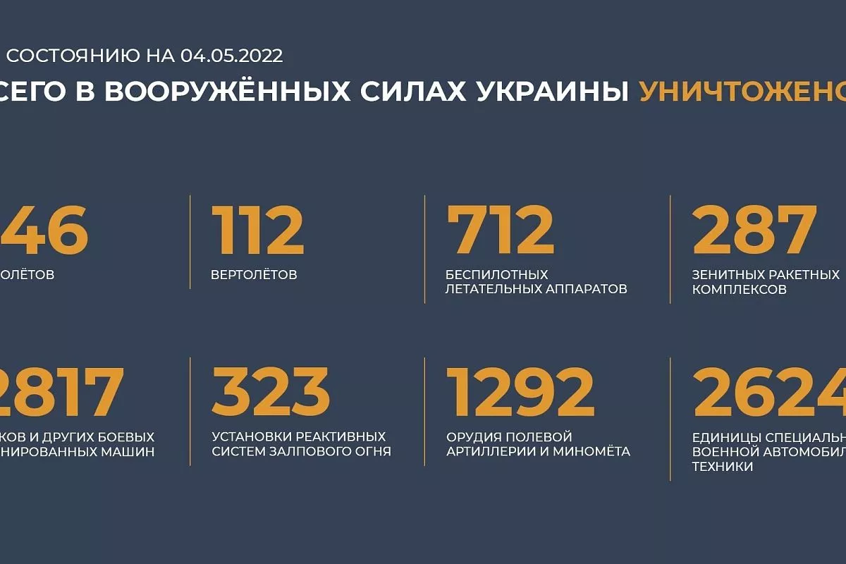 Кроме того, российскими средствами ПВО 4 мая уничтожены шесть украинских беспилотников в районах Авдеевки, Северодонецка, Веселая Гора ЛНР, а также над островом Змеиный. Кроме того, в районе Шпаковки Харьковской области сбиты в воздухе два реактивных снаряда систем залпового огня «Смерч».