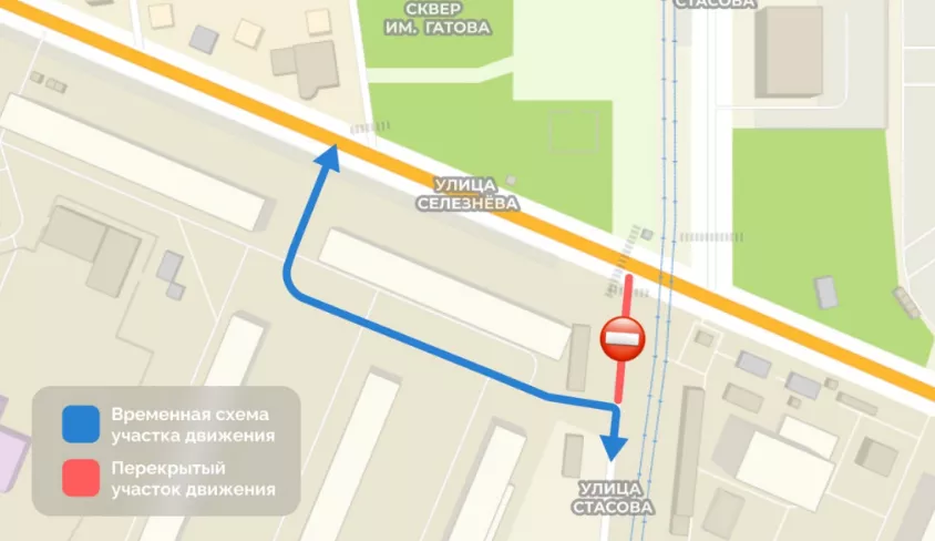 Уточняется, что на время проведения работ - с 1 по 27 июня - будет ограничено движение транспорта по улице им. Стасова: на участке от Селезнева до дома №132 по этой же улице. Разработана схема объезда.