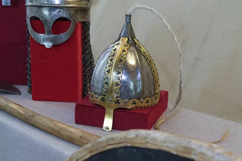 Отдельного внимания заслуживает зона военного обихода. Здесь представлены мечи и шлемы воинов-дружинников, кольчуга, метательное оружие. Стоит отметить, что кольчугу и шлемы самые многочисленные простые воины-ополченцы не могли себе позволить. Вместо этого они защищали себя тегиляем – доспехом, сделанным из ткани. Его репродукция также есть на выставке. Все мечи можно взять в руки, шлемы – примерить, это поможет зрителю выставки глубже погрузиться в атмосферу жизни русского средневековья. К слову, шлемы весят около 2 кг, прочувствовать это на себе будет интересно. Все оружие не заточено, так что дети смогут смело стать зрителями выставки.