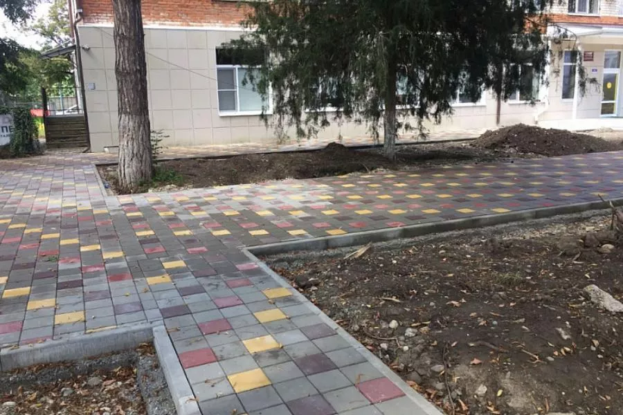 На территории выполнили демонтажные работы, частично уложили тротуарную плитку и бордюры, оборудовали въезды во дворы и парковки. Подготовили и забетонировали основание под детскую площадку.