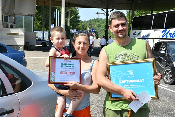 Житель Нижнего Новгорода Виктор Беляков приехал в отпуск в Сочи вместе с супругой Натальей и сыном Кириллом. Юбилейных гостей курорта торжественно встретили на посту «Магри» в Лазаревском районе. Им вручили подарочные сертификаты на бесплатное посещение «Сочи-парка» и семейный ужин в одном из ресторанов курорта.