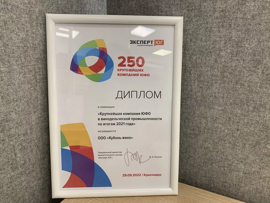 В рамках форума состоялась церемония награждения крупнейших региональных компаний, вошедших в рейтинг топ-250 аналитического центра «Эксперт Юг». Винодельня «Кубань-Вино» стала победителем в номинации «Крупнейшая компания ЮФО в винодельческой промышленности».