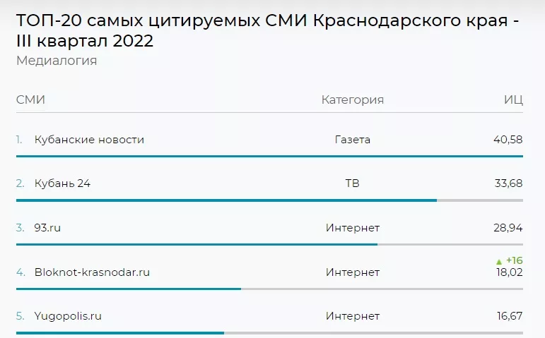 Компания «Медиалогия» опубликовала рейтинг медиаресурсов Кубани за третий квартал 2022 года.