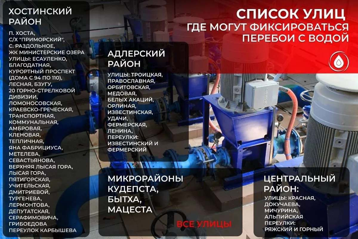 Насосы, питающие водой Адлер, Кудепсту, Хосту, Мацесту, Бытху, микрорайон Светлана и село Раздольное, остановят вечером 8 ноября для ремонта магистральной сети.