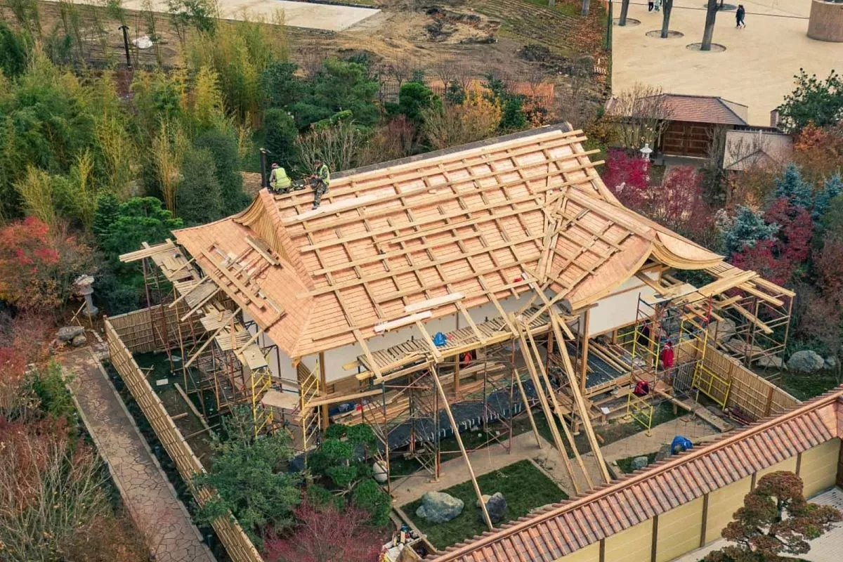 Полным ходом идет строительство здания, похожего на японский театр, а также расположенного у самого входа - на нем уже появилась крыша.