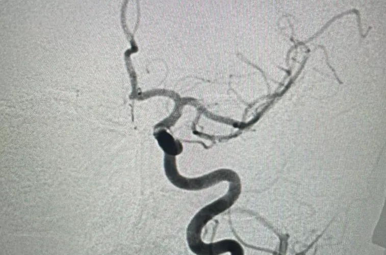 После обследований, в том числе КТ, у пациентки диагностировали ишемический инсульт в бассейне левой внутренней сонной артерии. Крупный тромб нарушил кровоснабжение головного мозга.