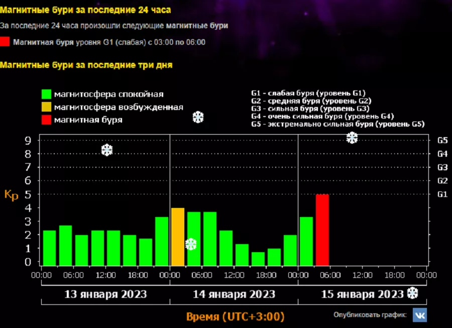 По данным на сайте Лаборатории рентгеновской астрономии Солнца Физического института Российской академии наук, 15 января в 3.00 началась слабая магнитная буря - уровня G1. Она не была спрогнозирована.
