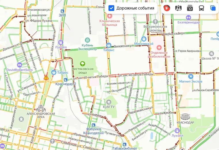 Пробки образовались на улицах Ставропольской, Селезнева и Новороссийской. Стоят улицы Российская, Восточно-Кругликовская, 40-летия Победы и 1-го Мая.