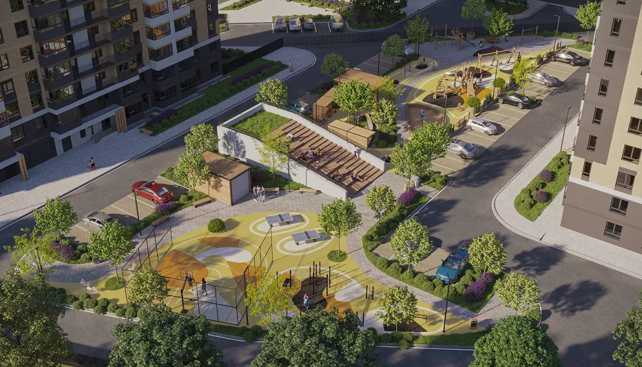 На территории спроектировано все необходимое для комфорта взрослых и детей: детские площадки с современным игровым оборудованием и мягким антиударным покрытием, а также места для воркаута и занятий йогой. При этом соблюдена гармония двора жилого комплекса – наиболее активные зоны вынесены как можно дальше от окон, уличное пространство не будет мешать покою и тишине жителей ЖК «Улыбка».