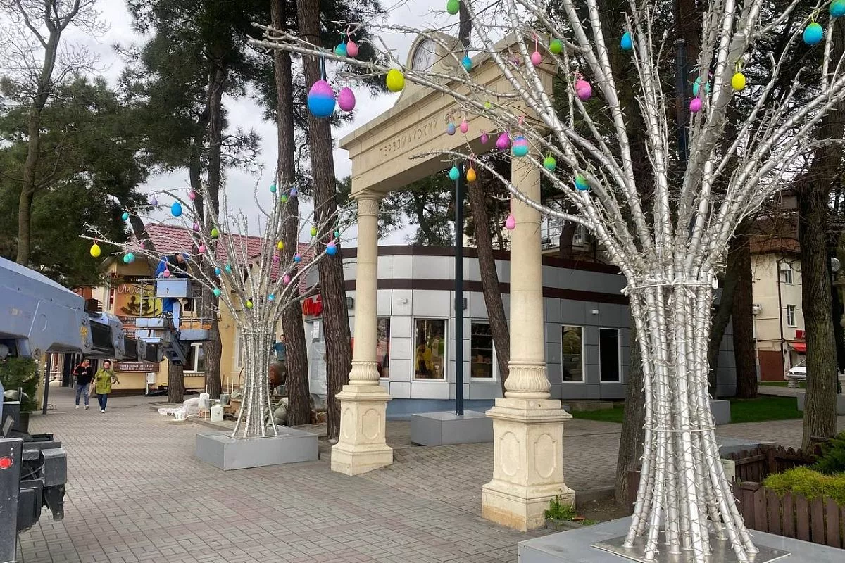 Так курорт готовится к празднику святой Пасхи. Разноцветные пасхальные яйца украсили деревья у входной группы в сквер Первомайский. Фото и видео опубликовал Telegram-канал «Pressa без пресса».