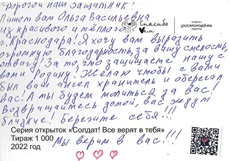 Накануне Дня Победы «Краснодарские известия» вместе с региональным управлением Росгвардии организовали акцию «Здравствуй, солдат!» и предложили жителям краевой столицы написать письма участникам спецоперации.