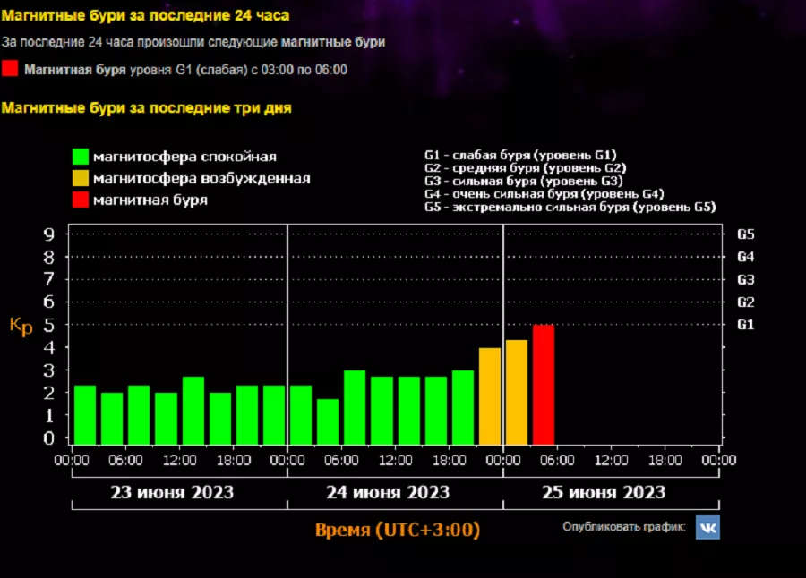 По данным на сайте Лаборатории рентгеновской астрономии Солнца Физического института Российской академии наук, 25 июня около 03.00 началась магнитная буря уровня G1.