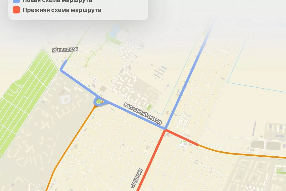 автобус № 56 — маршрут продлят до пересечения улиц Средней и Екатерининской. Он проедет по Западному Обходу, где свернет на улицу Конгрессную и вернется на Западный Обход