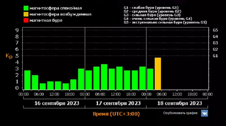 Всего в классификации магнитных бурь пять уровней - от G1 до G5. Считается, что слабая буря может спровоцировать незначительные сбои в работе энергосистем, а также повлиять на пути миграций птиц и животных. Сильные бури вызывают нарушения коротковолновой связи и работы навигационных систем, а также сбои напряжения в промышленных сетях.
