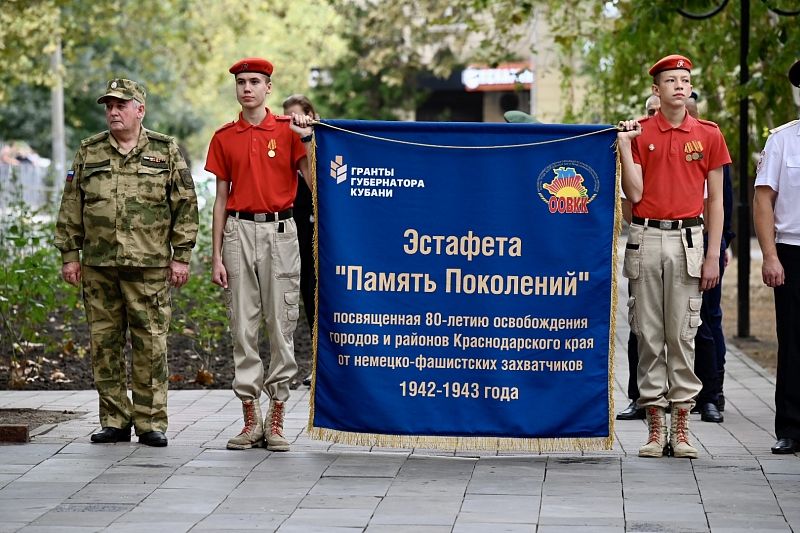 В день 80-летия освобождения Новороссийска от немецко-фашистских захватчиков, на площади Героев состоялась церемония торжественной передачи переходящего штандарта символа «Эстафеты Поколений». Из рук председателя Совета ветеранов города Абинска Виктора Остапченко штандарт приняли председатель Совета ветеранов города-героя Новороссийска Николай Клепанчук и представители общественной организации «Юнармия» и Поста № 1.