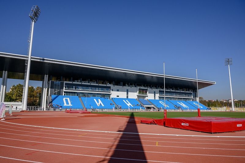 футбольное поле с восемью беговыми дорожками и разминочной зоной;