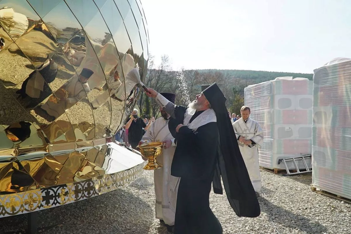 Владыка вместе с представителями геленджикского духовенства провел обряд освящения и окропил большой купол, два поменьше и кресты, которые теперь венчают строящийся храм. По словам самого Преосвященнейшего, с этого момента здание стало храмом.