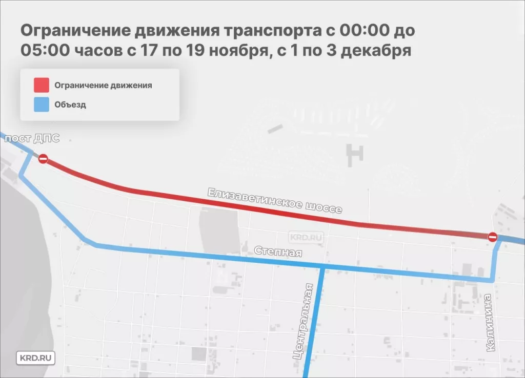 Работы по установке светофоров и знаков проведут в выходные дни в ночное время в два этапа: с 17 по 19 ноября и с 1 по 3 декабря. Для этого с полуночи до 05.00 перекроют движение на участках шоссе от ул. Калинина до поста ДПС в станице Елизаветинской.