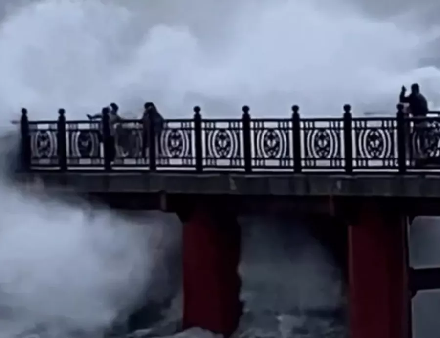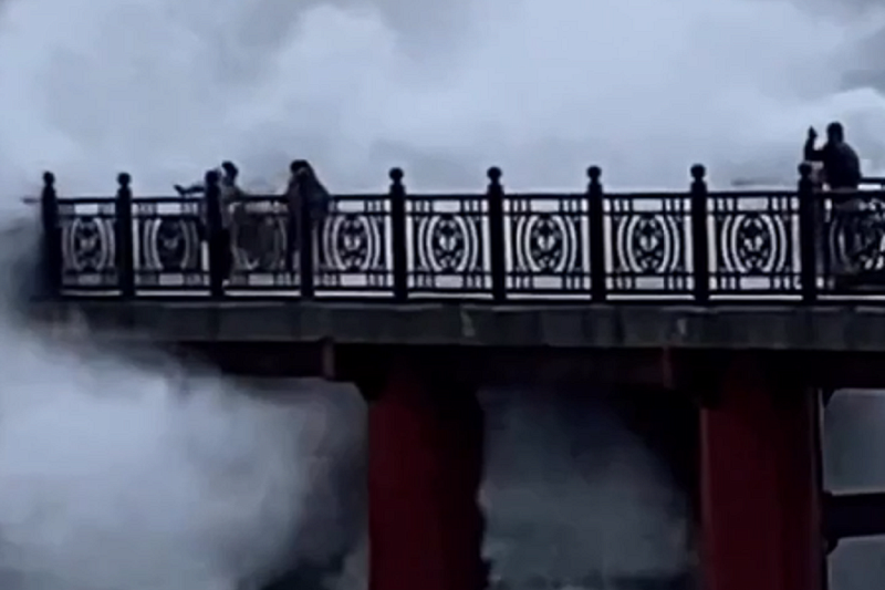 Очевидцы запечатлели прогуливавшуюся по пирсу в Адлере компанию, которую не смутили огромные волны. Одна из самых высоких выплеснулась наверх и едва не смыла женщину с коляской. Она чудом устояла на ногах.