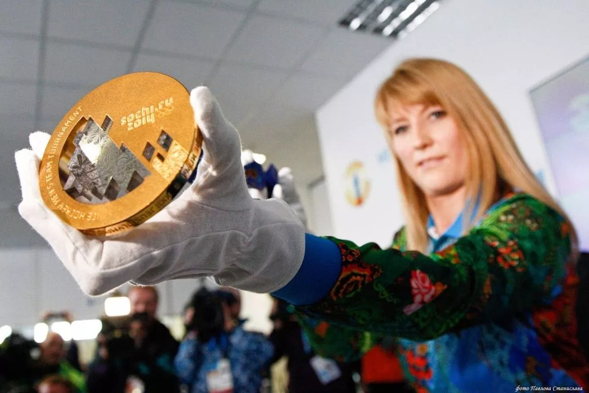 4 – Олимпийская чемпионка по конькобежному спорту Светлана Журова презентует медали Игр-2014. 2014 г.