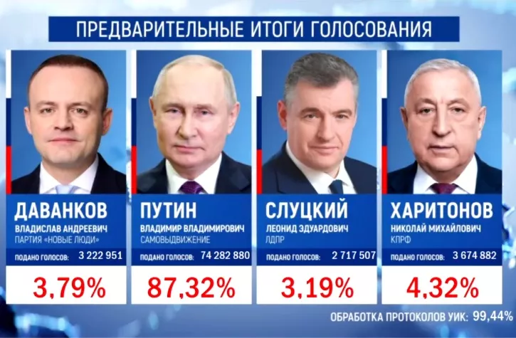 ЦИК РФ опубликовал данные после обработки 99,44% протоколов. Кандидат и действующий президент РФ Владимир Путин (самовыдвиженец) набирает 87,32% голосов, Николай Харитонов (КПРФ) - 4,32% голосов, Леонид Слуцкий (ЛДПР) – 3,19% голосов, вице-спикер Госдумы Владислав Даванков («Новые люди») – 3,79% голосов.