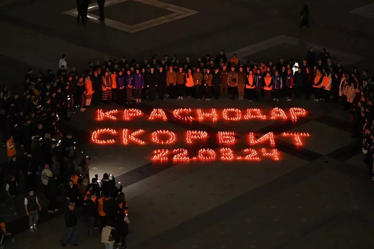 В день общенационального траура на Главной городской площади Краснодара провели акцию в память о погибших при теракте в Подмосковье. Горожане из свечей-лампад, их потребовалось более 500, выложили фразу «Краснодар скорбит». На экранах - журавли. Такая же проекция этим вечером появилась на здании «Крокус Сити Холла» в память о жертвах теракта.