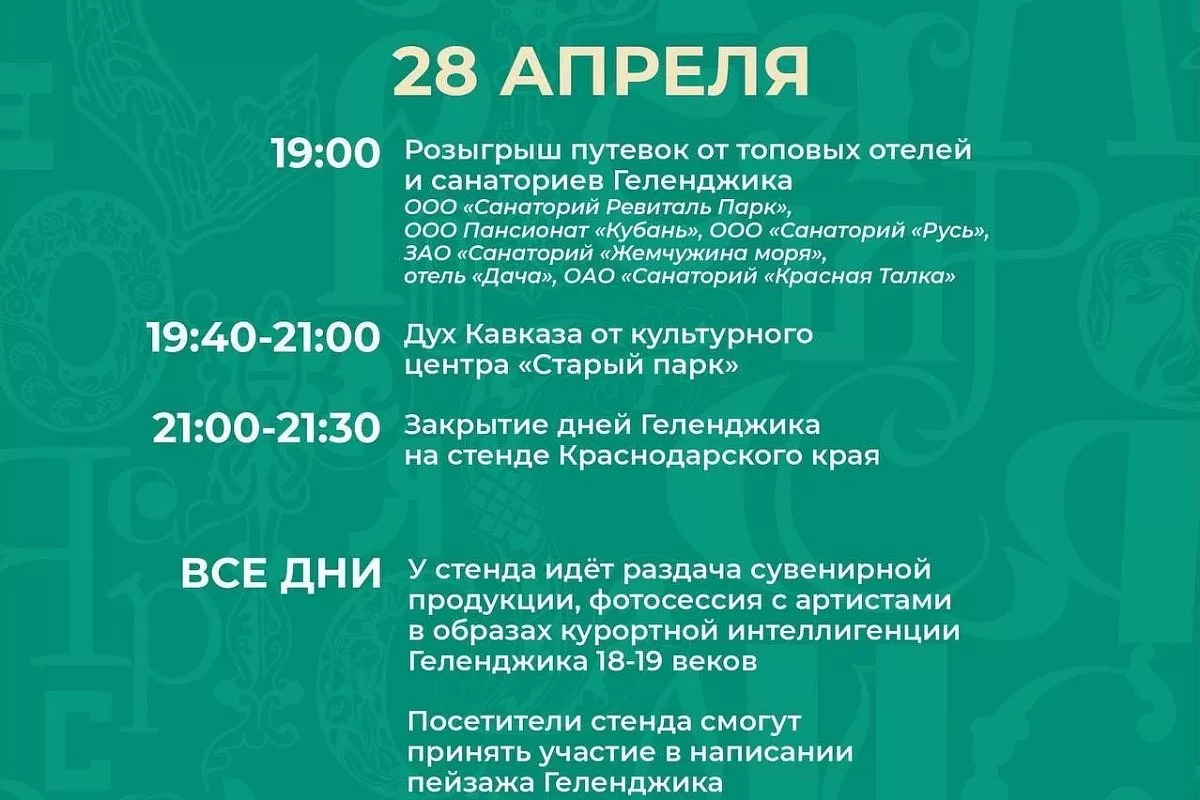 В рамках Международной выставки-форума «Россия» на ВДНХ с 27 по 28 апреля на стенде Краснодарского края пройдут дни Геленджика под эгидой «Открой для себя Геленджик».
