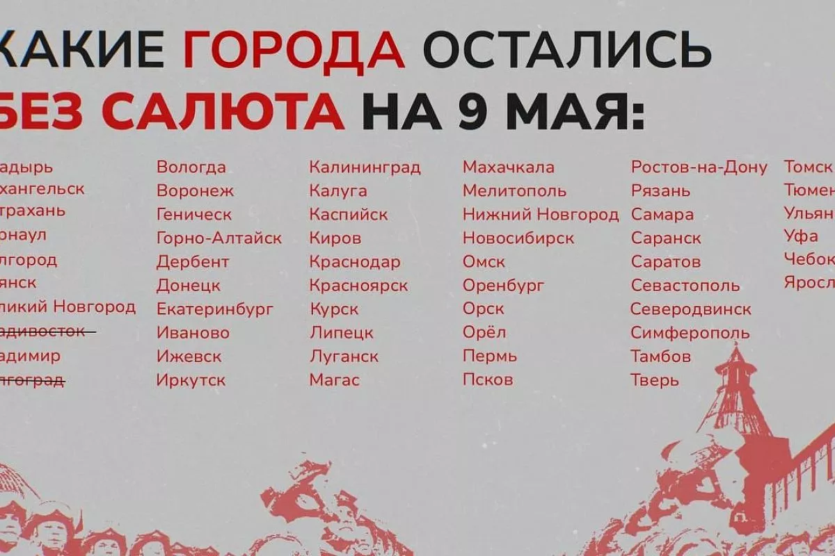 Telegram-канал Mash показал, какие города в День Победы останутся без салютов. В списке 54 города, среди них Ростов-на-Дону, Севастополь, Воронеж, Белгород, Самара, Рязань, Великий Новгород, Тверь и другие.
