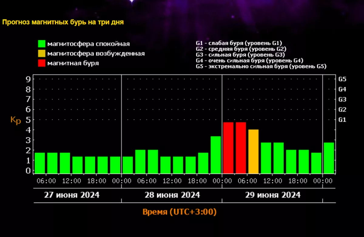 Шестичасовая магнитная буря уровня G1 может накрыть Землю в конце месяца. По прогнозу на сайте Лаборатории солнечной астрономии ИКИ и ИСЗФ, пик ее придется в ночь на 29 июня. Завершится она утром.