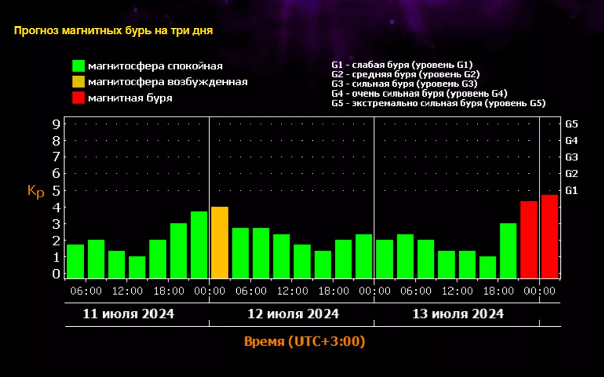 Магнитная буря уровня G1 ударит по Земле вечером 13 июля. Продлится она около шести часов - до утра следующих суток. По прогнозу на сайте Лаборатории солнечной астрономии ИКИ и ИСЗФ, начнется буря в 21.00 13 июля и будет постепенно усиливаться.