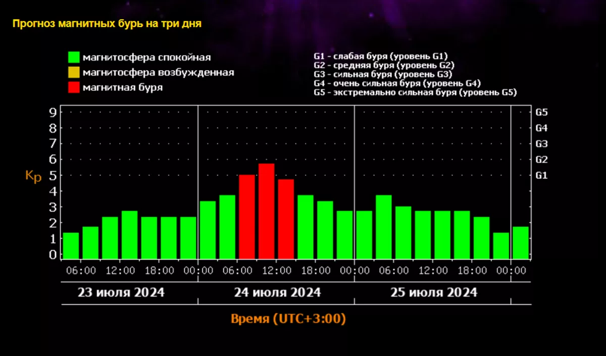 Магнитная буря уровня ударит по Земле утром 24 июля. Продлится она порядка девяти часов. По прогнозу на сайте Лаборатории солнечной астрономии ИКИ и ИСЗФ, завершится буря уже после полудня. Пик ее придется с 9.00 до 12.00 – в это время она может усилиться до уровня G2.