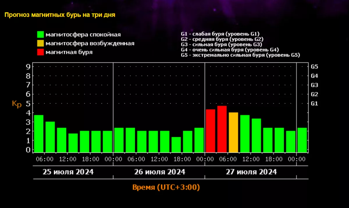 Магнитная буря уровня G1 ожидается в ночь на 27 июля.