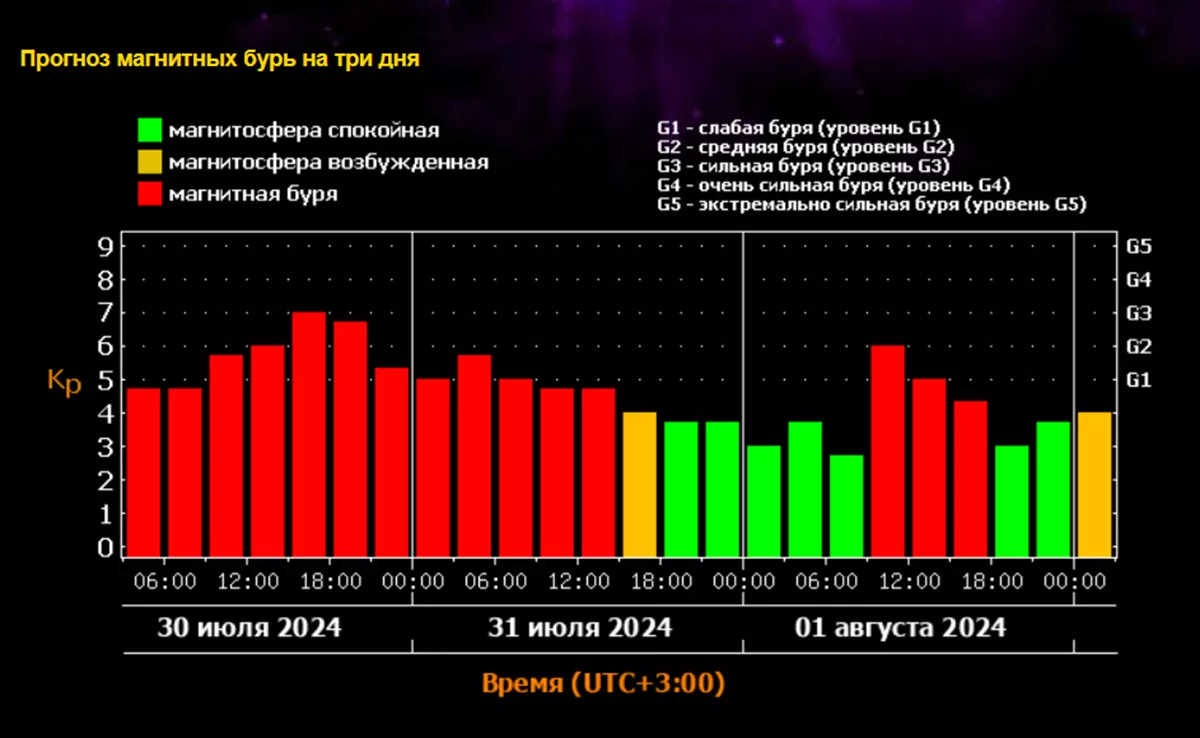 Новые прогнозы, опубликованные на сайте Лаборатории солнечной астрономии ИКИ и ИСЗФ, подтверждают высокую вероятность магнитных бурь 30 июля - до сильного уровня G3. Возмущения - до G2 - возможны также 31 июля и 1 августа.